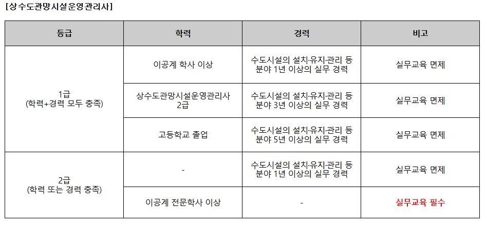 안녕하십니까. 상수도관망시설운영관리사 양성과정 실무교육에 대해 안내드립니다. 자격증 별 실무교육 대상자는 아래와 같습니다.