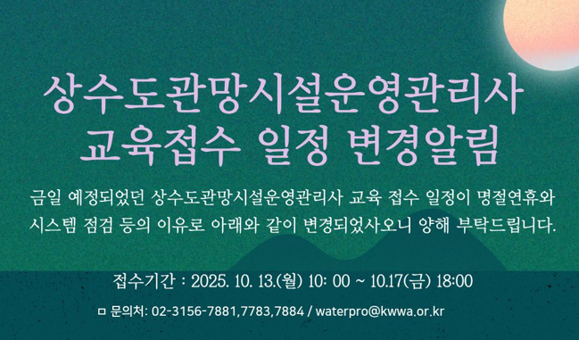 금일 예정되었던 상수도관망시설운영관리사 교육 접수 일정이 명절연휴와 시스템 점검 등의 이유로 아래와 같이 변경되었사오니 양해 부탁드립니다.
