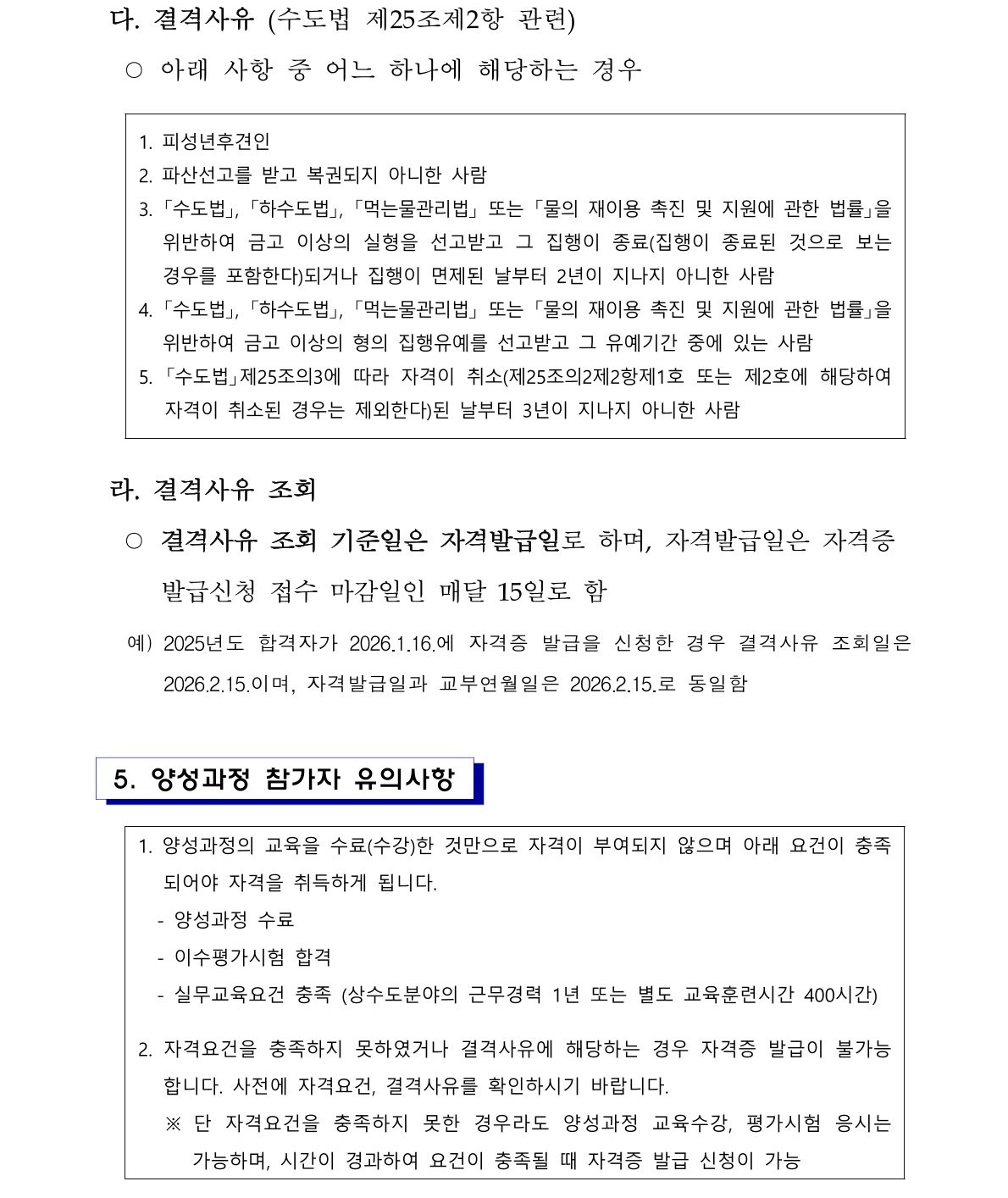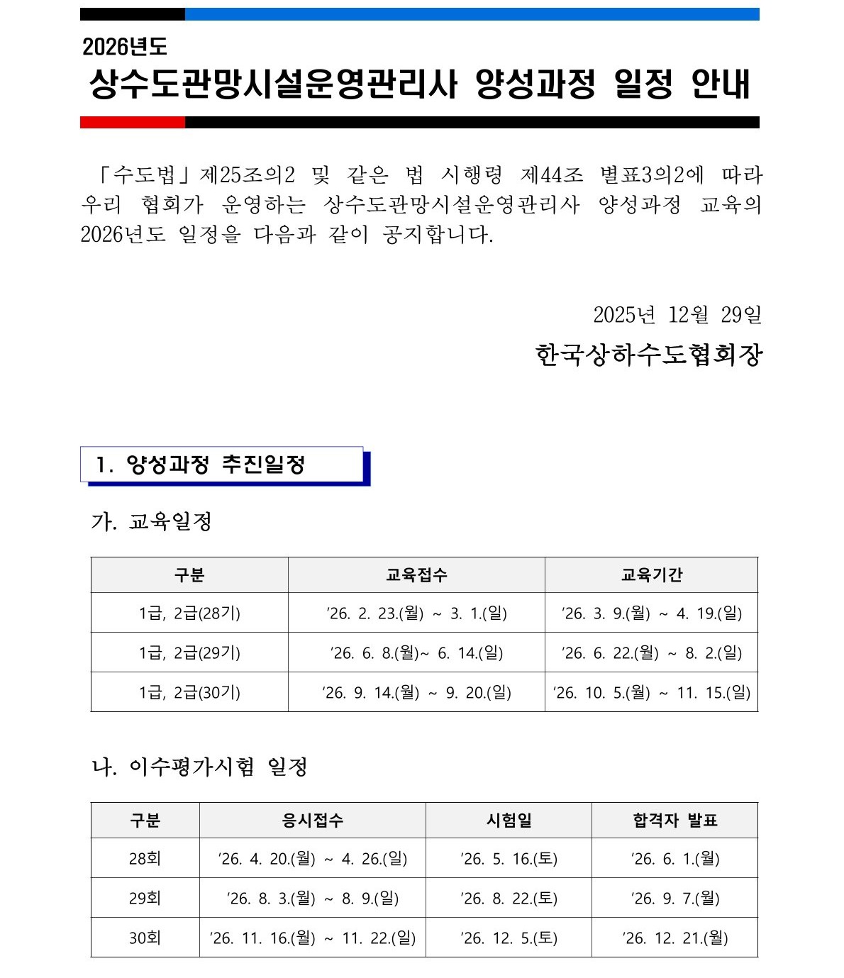 2026년 상수도관망시설운영관리사 양성과정 일정 공지