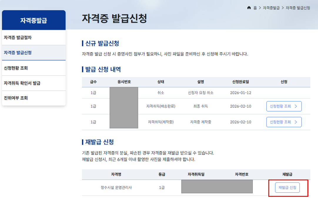 3단계 자격증 발급 신청 > 하단 '재발급 신청' 클릭