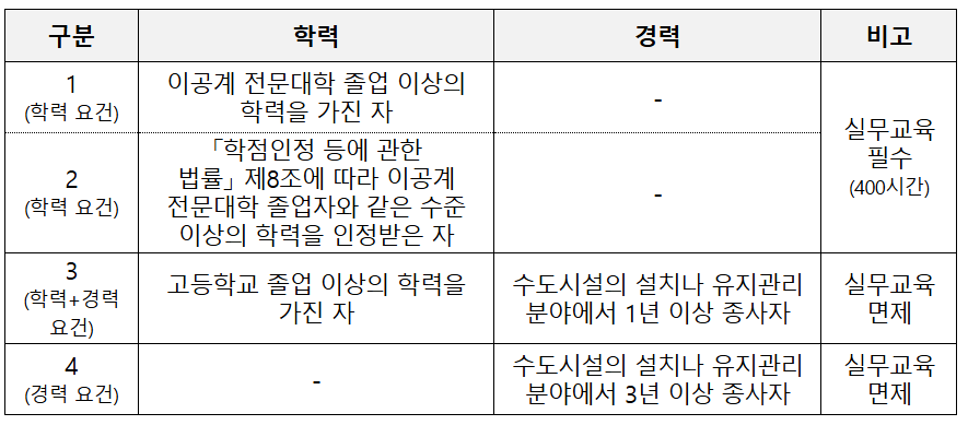※ 상수도 분야 고용노동부 직업능력개발훈련을 400시간 이상 수료한 자는 실무교육을 면제함
