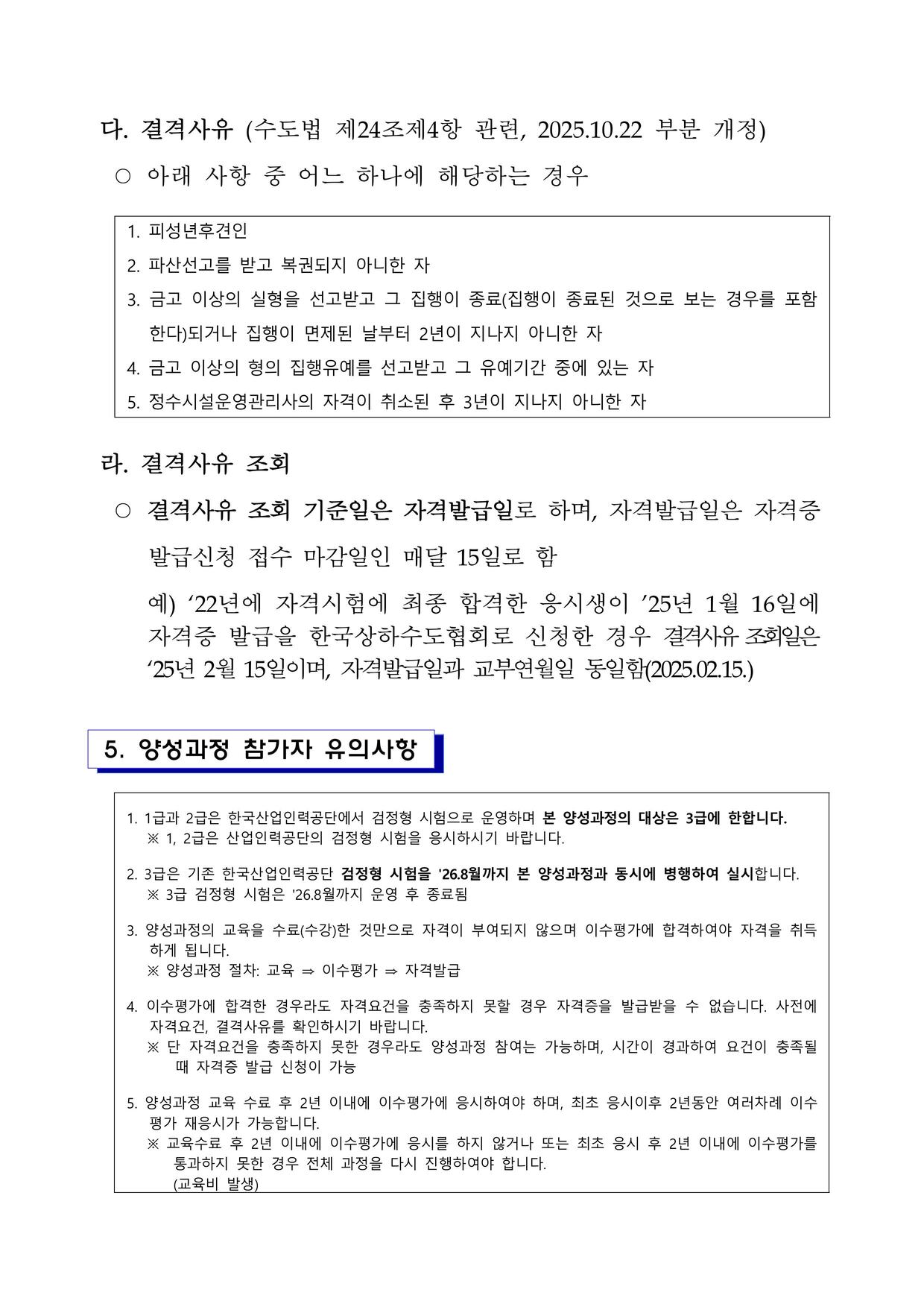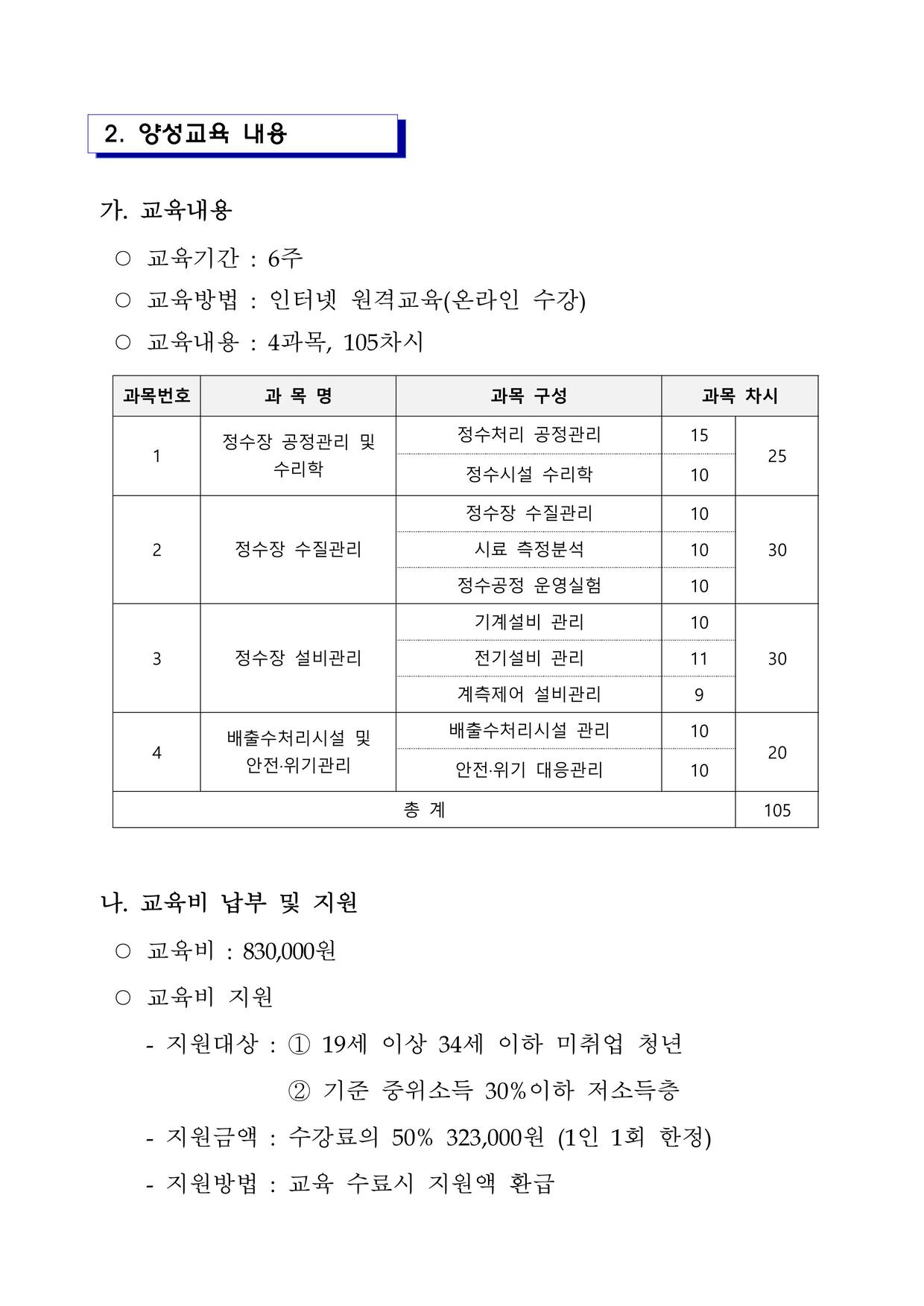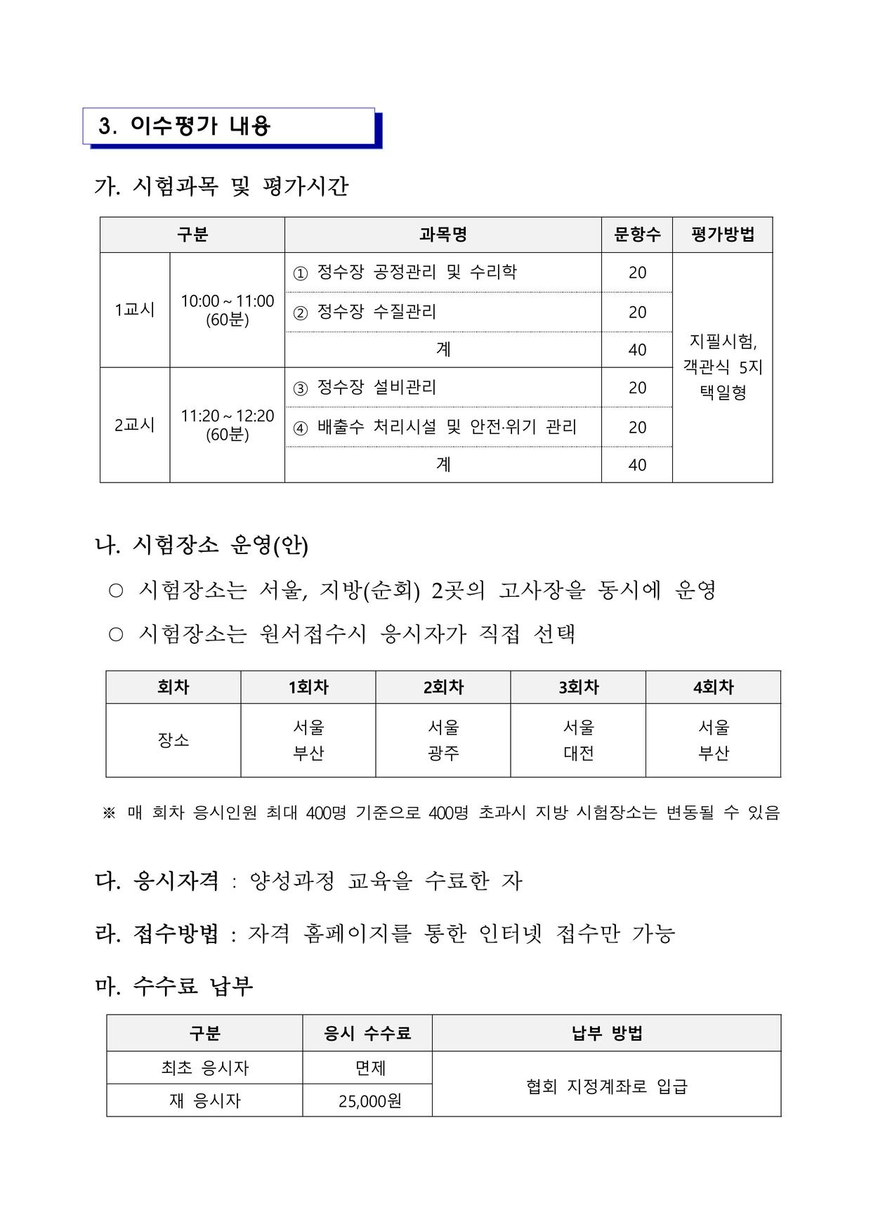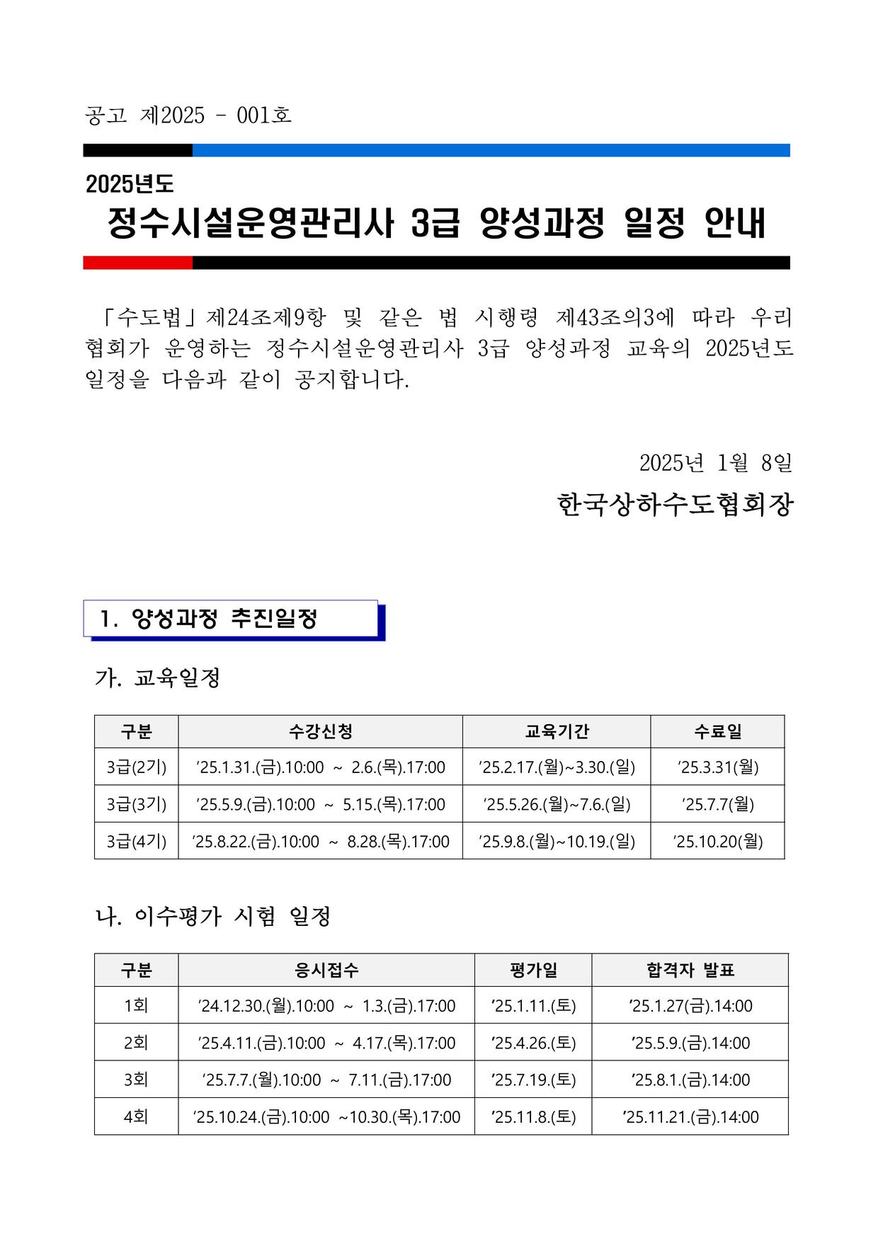 2025년 일정공지 정수시설운영관리사 3급 양성과정(집체교육 및 이수평가 일정)