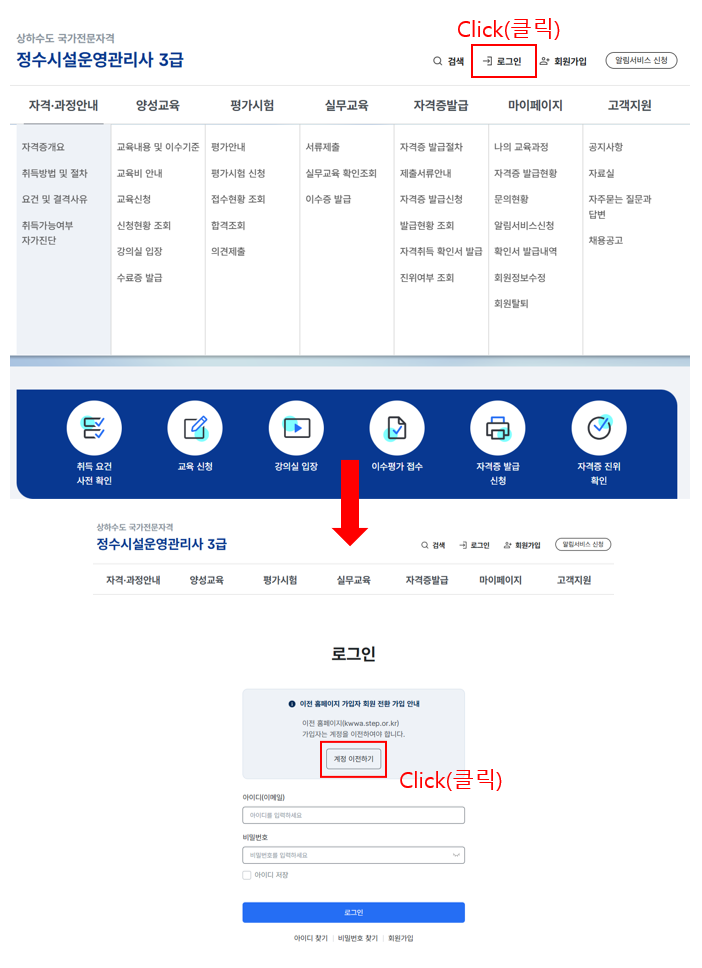 계정 이전 방법: 한국상하수도협회 정수시설운영관리사 홈페이지 → [로그인] 클릭 후 [계정 이전하기] 진행